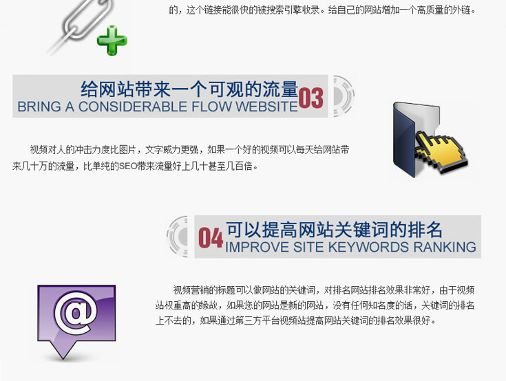 由于每一个用户的媒介和互联网接 触行为习惯不同,这使得单一的视频传播很难有好的效果。因此,视频营销首先需要在公司的网站上开辟专区,吸引目标客户的关注,其次,也应该跟主流的门户、 视频网站合作,提升视频的影响力,而且,对于互联网的用户来说,线下活动和线下参与也是重要的一部分,因此通过互联网上的视频营销,整合线下的活动、线下 的媒体等进行品牌传播,将会更加有效。