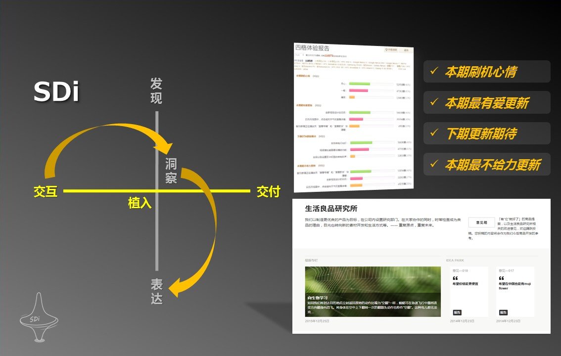 无印良品的“生活良品研究所”以及小米的“四格报告”都是这方面的应用典型。“四格报告”是小米在每次系统更新后的用户投票,“生活良品研究所”是一个为MUJI提供了众多产品优化建议的线上社区。通过与用户互动,这些品牌获得了更深层次的“洞察”,然后借此来优化自己的产品与服务。