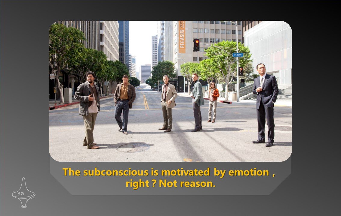 SDi的提出,想法原型在很大程度上得益于《盗梦空间》给我带来的启发。这部电影的点题金句是男主角Cobb在制定inception策略时说的:“ The subconscious is motivated by Emotion,Not reason.”(潜意识受情感驱动,而非原因)。该团队的“营销”目标是让一个商业帝国的继承者亲手解散这个由他父亲创建的王国,通过3层梦境的精巧递进,这个inception的核心信息被放在了“我父亲不想让我成为第二个他”这一情感诉求之上。