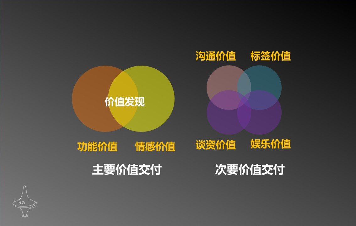SDi认为,品牌的“价值交付”有主次之分。其中,包含了“功能”和“情感”的“价值发现”是品牌要向用户交付的主要价值。但消费者的行为变幻莫测,品牌不能要求每一个消费者每时每刻地“懂你”,因此我们说:核心用户为品牌的主要价值买单,普通用户为品牌的普世价值买单;所以,在提升主要价值交付之外,品牌还要想办法交付更多“次要价值”。