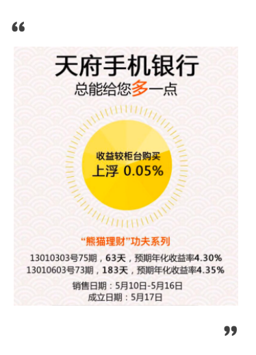 “你浪费了5斤猪肉。因为懒得下载APP,你没有选择更高利率的银行,白白浪费50元利息。”“天府手机银行,比柜台的利息更高,而你需要的,仅仅是扫描二维码。”(当然也可以说“你浪费了1杯哈根达斯”、“20碗米饭”之类的)